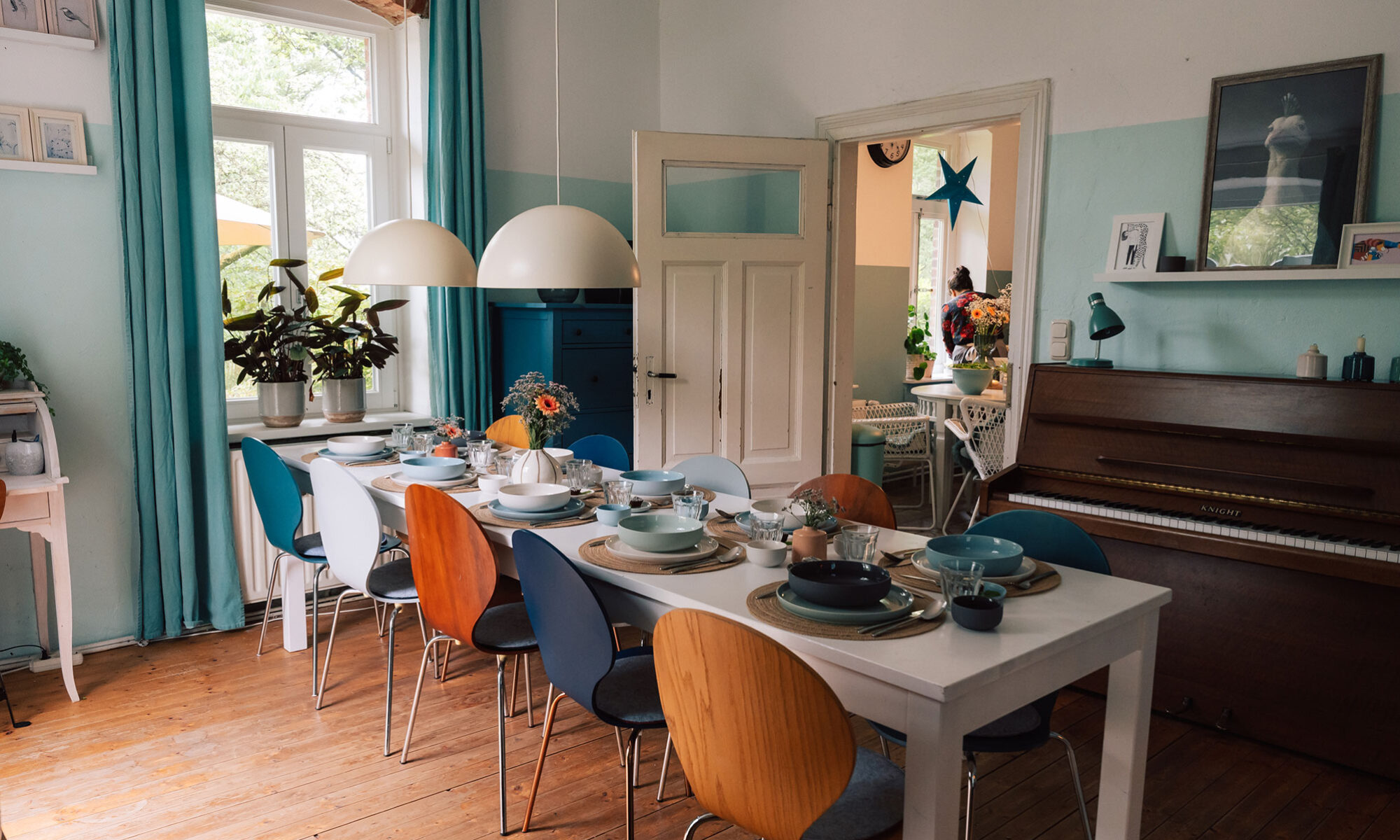 Ein Natursteinhaus im Grünen mit weitläufigem Garten, mitten im Wald am Rande der Stadt. Eine lange Tafel, mit bunten Stühlen, füllen im hellen Altbau den Raum. Teller und Gläser im skandinavischen Stil, frisches, meist vegetarisches, Essen für 10 Personen. Das Zimtzimmer ist ein Ort an dem Leichtigkeit, Austausch und Lernen sich organisch verbinden können.